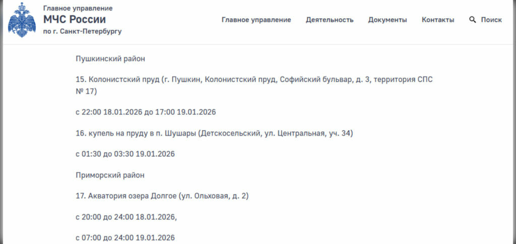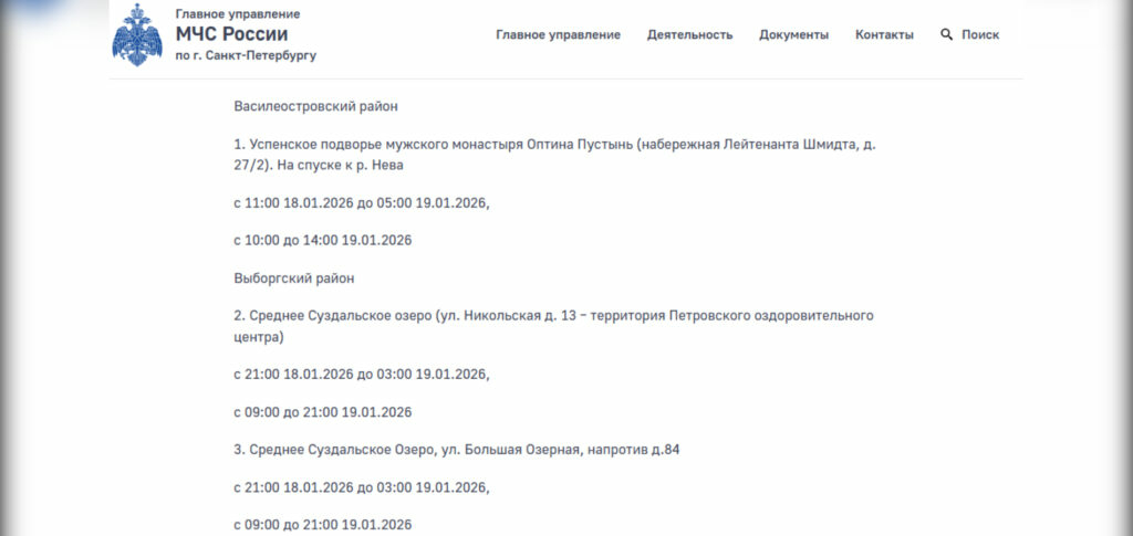 Сотрудники МЧС обновили информацию о времени работы купелей, где будут дежурить спасатели в ночь на 19 января и весь праздничный день. Всего в Петербурге будут работать 17 официальных иорданей.