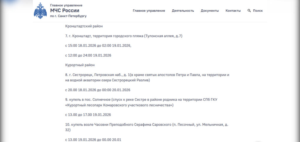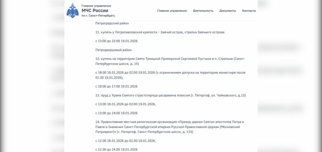 Главное управление МЧС России по Санкт-Петербургу вновь внесло коррективы времени работы официальных крещенских купелей в ночь на 19 января и в течение праздничного дня.