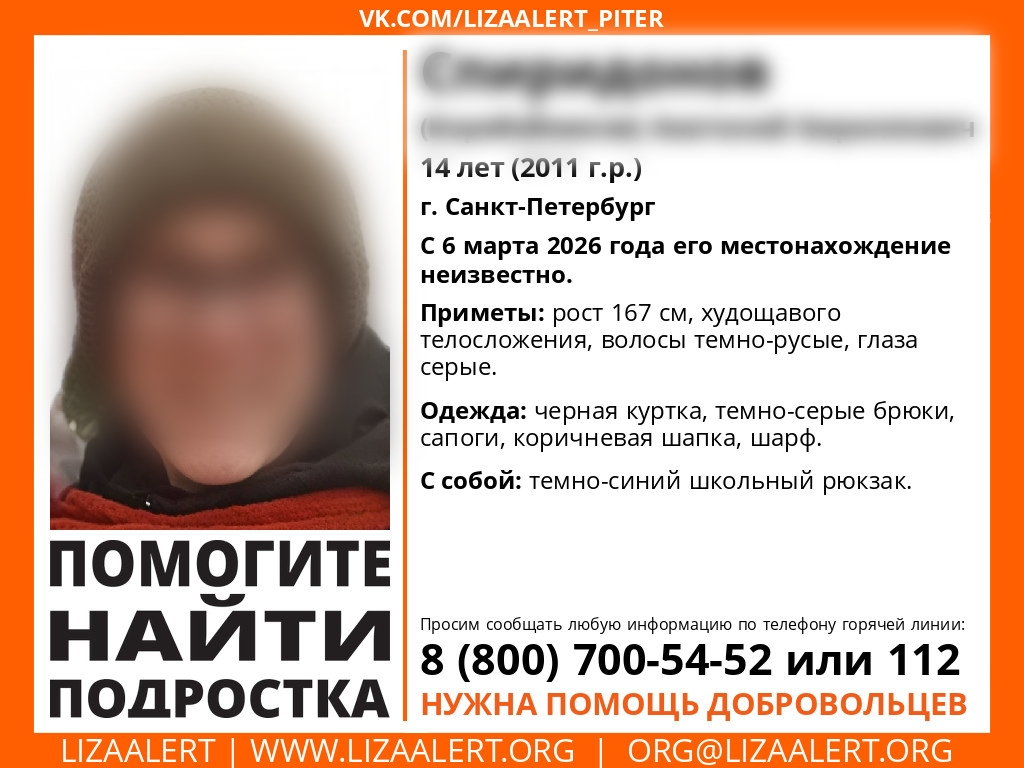 В Петербурге пропал 14-летний подросток. Он имеет рост 167 см, худощавое телосложение, темно-русые волосы и серые глаза. На момент пропажи школьник был одет в коричневую шапку, черную куртку, серые брюки, шарф и сапоги. С собой он нес темно-синий рюкзак, а на фото изображен в очках. Информацию о нем опубликовали на сайте петербургского ПСО «ЛизаАлерт».